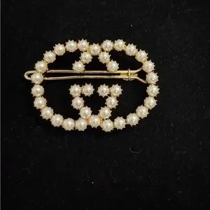 Chic Gucci brooch with gold accents and pearl detailing. Perfect for elegance.