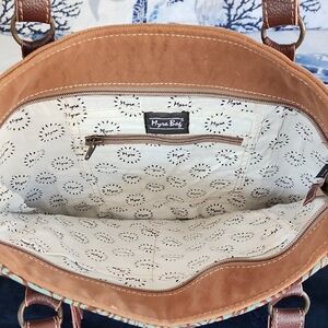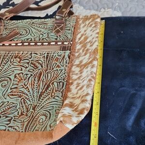 This Myra Bag tote combines rustic charm with modern flair, featuring a striking brown and blue design. Crafted with high-quality materials, it offers ample space for everyday essentials while showcasing a unique Western-inspired aesthetic.