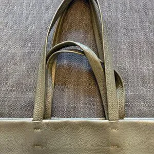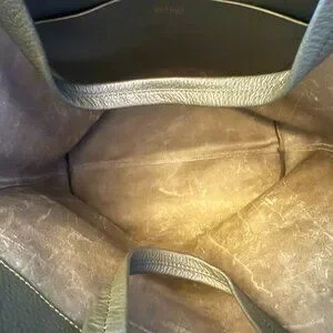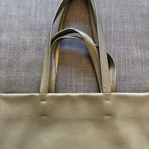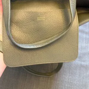The minimal Cuyana brand label is embossed on the front bottom of the tote and on the inner flap pocket. Cuyana is known for their exceptional quality leather bags; this tote with its versatile straps and tall silhouette combine elegant sophistication with quality and functionality, in striking dark olive color is no exception.