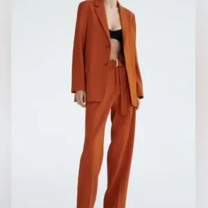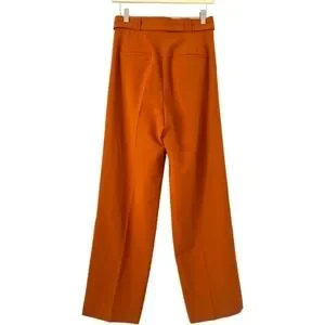 These Zara wide-leg pants in a vibrant orange hue feature a high-waisted design. Pants have a traditional button and clasp closure but a belt with a stylish d-ring closure detail can be added to complete the look. Crafted from a professional, wrinkle resistant lightweight slacks fabric, they offer a relaxed fit perfect for both casual and chic occasions. I have shortened the pants to 39 inches using double stick fabric tape, but an additional 3 inches of length can be added by undoing the tape.