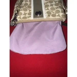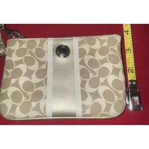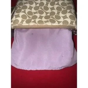 Coach tan and gold wristlet pouch. See photos there are a couple very small spots on the inside lining but other than that, this is in great condition.