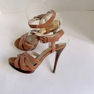 MICHAEL Michael Kors brown leather platform heels. Crisscross detailing Color luggage Very good condition - missing strap loop on one side. Heel 4.5” Platform 0.5”