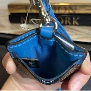* Features the classic coach “C” monogram pattern in khaki color, contrasted by a bright blue leather trim. Has a detachable strap.