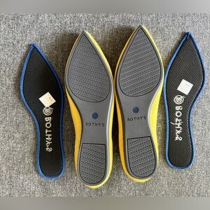 sustainability with these Rothy's pointed toe ballet flats in vibrant yellow. Made from recycled water bottles, they feature a sleek, leg-lengthening silhouette, breathable knit upper, and cushioned insole for all-day comfort. Fully machine washable and eco-friendly— perfect for work, travel, or everyday wear.