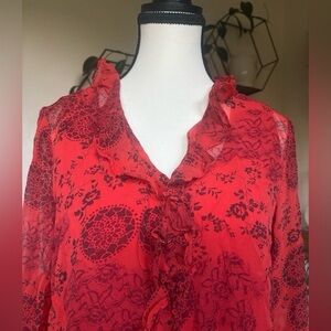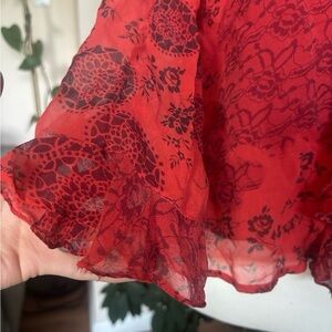 Channel early 2000s romantic vibes with this stunning Y2K red silk blouse from New York City Design Co Made from 100 silk this sheer blouse showcases an intricate lace and floral pattern in bold red and black with a true red silk lining Feminine ruffle detailing cascades down the front and trims the neckline while flared cuffs complete the vintageinspired look