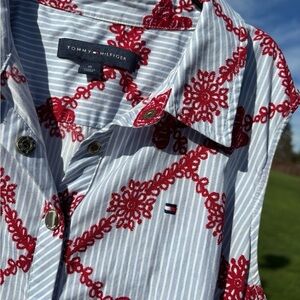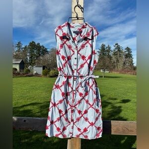 Gotta love a dress on those days that you just dont know what to wear Youre sure to get compliments in this easy to wear and classic dress Beautiful 100 cotton Tommy dress with gold coloured snap buttons and tie waist Beautiful soft blue and white stripe pattern with a bold eye catching red