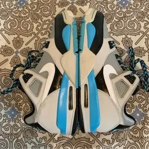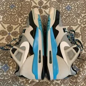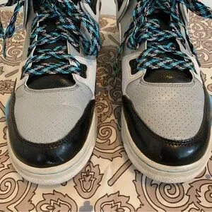 Nike Air Flight Condor Unisex Sneakers Women’s 10.5 / Men’s 9. Black, Gray, Turquoise Blue and White. Leather upper, color coordinated shoe strings, low top, padded collar, fabric lining, rubber outsole. Gently used, very good condition, a few light scuffs, see all pictures for details and wear.