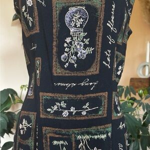 Adorable vintage sleeveless dress by Chablis featuring a whimsical floral patchwork print with labeled botanical illustrations and charming cottagecore vibes This dress is perfect for layering or wearing on its own through spring and summer The hem is finished with a subtle contrast stitch for extra charm