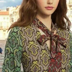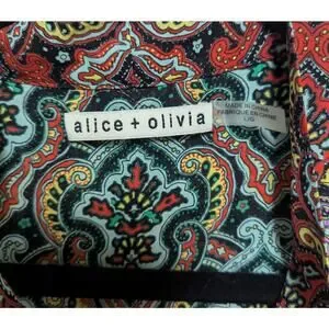 Make a bold statement with this Alice + Olivia long sleeve silk blouse in size Large. Featuring a richly detailed paisley print in vibrant green, red, purple, and yellow tones, this top is crafted from a lightweight, semi-sheer silk blend. The standout feature is the elegant self-tie bow at the neckline, giving it a chic, feminine finish. A perfect blend of retro charm and modern sophistication, this blouse pairs beautifully with high-waisted trousers, pencil skirts, or jeans for a fashion-forward look. Excellent condition. A luxe piece for work, events, or editorial styling.