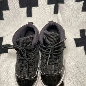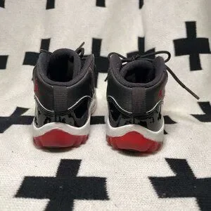 Classic Nike Air Jordan 11 Retro “Bred” sneakers in toddler size 10C. Featuring the iconic black patent leather upper, white midsole, and red outsole, these mini J’s are a must-have for any little sneaker fan or collector parent.