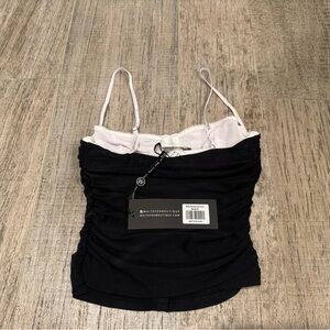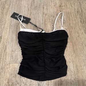 Get the old money aesthetic with the Remind Me Again Top Black. Features ruched side design, semi sheer, mesh lined fabric, thin adjustable straps and is a two piece set with an attached mesh crop, bust cups and underwire, hook and eye back closure and mesh lined fabric. Pair with mid rise jeans for a super chic look!