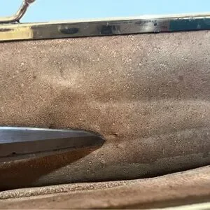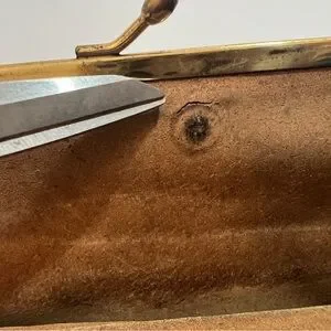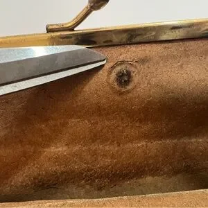 • There are many pinpoints on the front exterior and shows on the interior. It looks as if someone had decorated with a broach, but I am unsure. (SEE PHOTOS)