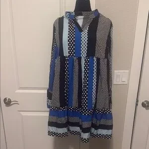 Stylish dress with a mix of black, blue, and white patterns. Perfect for any occasion.