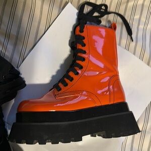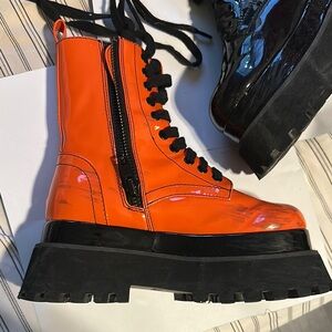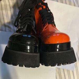Dolls Kill mismatched boots 6 please look at all pictures as is these are awesome!!!! sooo hot so comfortable, please look at the back of the orange shoe might need a little glue i tried to capture everything in the picture please let me know if you have any questions eeds to be cleaned perfect for halloween 🎃 Step out in style with these striking black and orange women's boots. Perfect for making a bold statement, these boots offer both comfort and fashion.