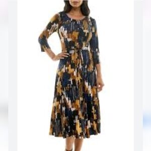 The Nina Leonard dress showcases a sophisticated black and gold abstract print, perfect for casual or work settings. With its 3/4 sleeves and scoop neckline, this sheath dress offers a flattering fit. The soft fabric drapes elegantly, making it a versatile addition to any wardrobe.