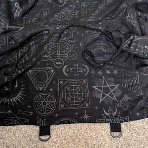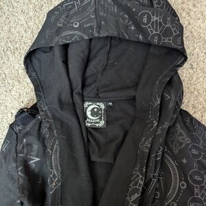 Enchanting black cloak with mystical symbols. Hooded design for a mysterious vibe. Ideal for making a statement.