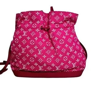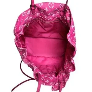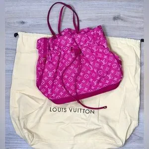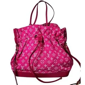 The Noéfull…cross between the Noé bucket bag and the Neverfull. From 2013 collection, features deep pink and white monogram canvas with leather trim and straps and gold tone hardware. Drawstring feature allows shaping and closure to your liking.