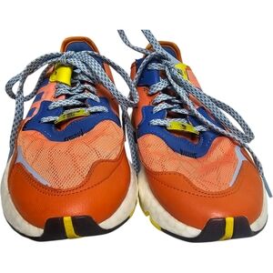 Vibrant Adidas sneakers with a mix of orange, blue, and yellow. Perfect for a bold look.