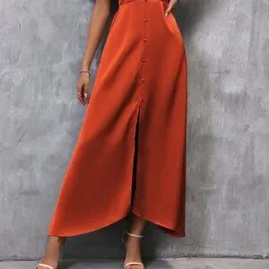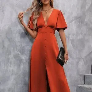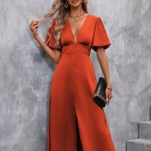 Orange Preppy Womens Plunging Neck Butterfly Sleeve Split Thigh Satin Dress