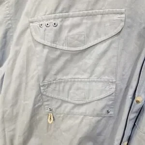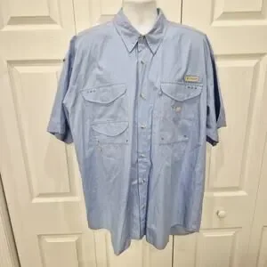 The Columbia PFG Shirt for Men in size 2XL is a blue button-down shirt specifically designed for fishing enthusiasts. Made of a blended fabric, this lightweight and breathable shirt features vented pockets and a tagless design for added comfort. With a collared neckline and short sleeves, this easy-care shirt is perfect for outdoor activities like fishing, camping, and hiking during the spring, summer, and fall seasons. The Columbia brand logo adds a touch of style to this functional and practical fishing shirt.