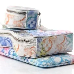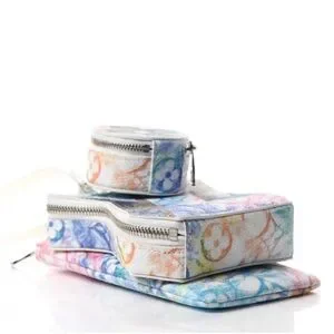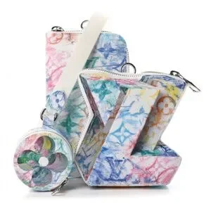 Vibrant Louis Vuitton set with artistic monogram. Includes three unique pieces. Perfect for adding flair.