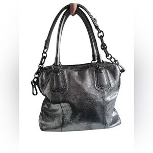 Stylish Coach shoulder bag with metallic finish. Features studded design and dual handles.