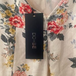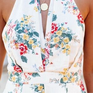 This stunning DO+BE romper features a flattering halter neckline, deep V front, and an open back silhouette. The soft white base is adorned with a romantic floral print in shades of red, yellow, green, and blush. Cinched waist and flared shorts give it a fit-and-flare dress look with the comfort of a romper. Fully lined and perfect for summer events, brunches, or a sunny vacation day. Hidden back zipper. Brand new with tags.