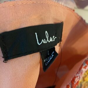 Lulus Brand. Size Large. Floral orange, yellow, silver, pink top. Ribbon can be untied/retied. No padding and no padding pockets.