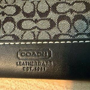 Elegant Coach wallet with signature pattern. Features black and cream design. Dimensions: 4.25” length X 3” height