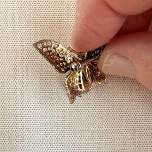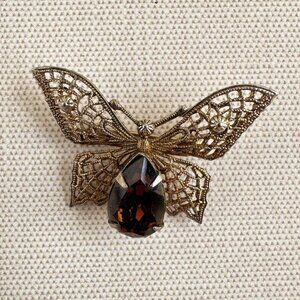 This delicate butterfly pin features intricate brass filigree wings adorned with rhinestones and a bold amber center—a lovely vintage figural pin.