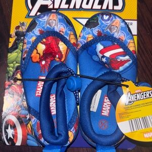 Marvel Avengers slippers for kids. Features vibrant blue with superhero graphics. Comfortable and fun design.