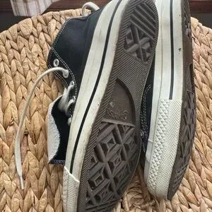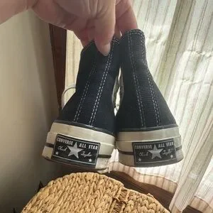 Classic black high-top sneakers with white laces and soles. Iconic Converse logo on the side. Only worn a handful of times