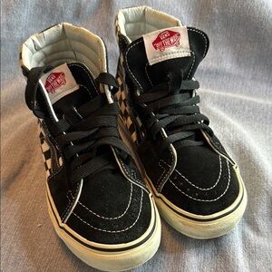 These Vans sneakers feature a classic high-top design with a black suede and canvas upper, complemented by a white leather Jazz stripe. The shoes are equipped with a padded collar for added comfort and a durable waffle pattern sole for excellent grip. Please examine photos. Laces included, but don’t match.