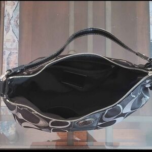 This stylish Coach shoulder bag features a sleek silver and black color combination, highlighting the brand's signature design. Its structured silhouette and premium craftsmanship make it a versatile accessory for any occasion. The bag's elegant appearance is a testament to Coach's commitment to quality and timeless fashion.