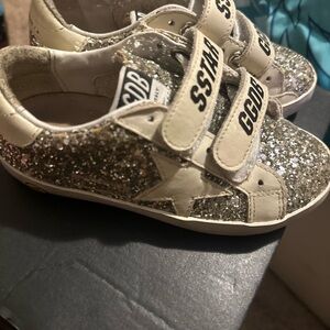 Step out in style with Golden Goose sneakers, featuring a striking silver and cream color palette. These low-top sneakers combine a metallic silver base with glittery details and practical velcro straps for easy wear. Perfect for casual outings, they offer a blend of comfort and flair, making them a versatile addition to any wardrobe.