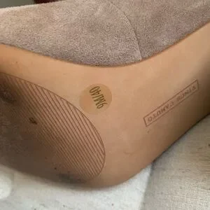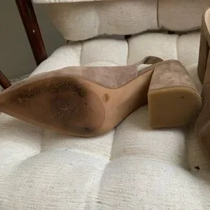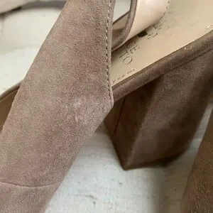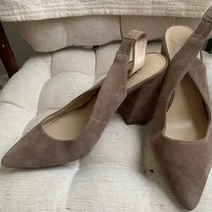 Vince Camuto suede sling back block heel. They are a darker nude tone. Size 9. Worn for a few weddings/special events, but after two babies they just don’t fit anymore. They were very comfortable and I got lots of compliments. One scuff mark in the suede and some scuffing on the bottoms, but otherwise great gently used condition! Comes from a smoke free/pet free home.