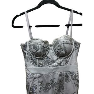 Medium Elegant NBD mini dress with floral lace. Features delicate straps and a scalloped hem. Perfect for a night out.