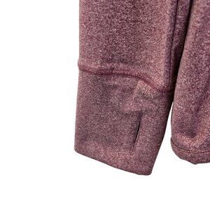 Really nice hooded activewear sweatshirt that has a kangaroo pocket in the front, thumb holes on the sleeves and a tie at the neckline. The color is a heathered wine color.