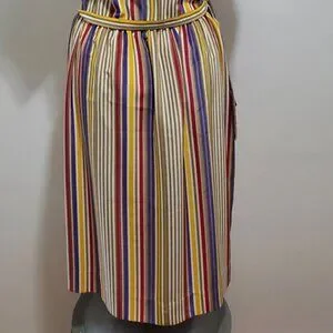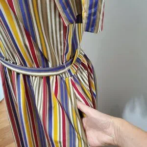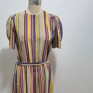 This colorful, striped, vintage Executive Dress by Albert Nipon is stunning! This pull-on dress boasts five mother-of-pearl button closures at each shoulder, an elastic waist, a matching fabric tie belt, and a silky polyester fabric. The dress is midi length with half sleeves, and...pockets!