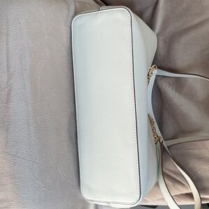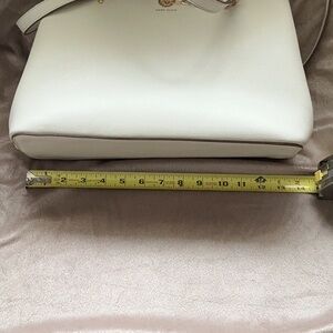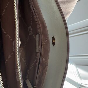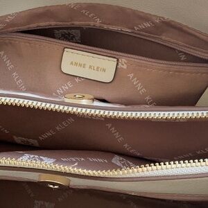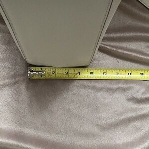 Discover the elegance of the Anne Klein shoulder bag, crafted in off- white with luxurious gold accents. This sophisticated accessory features a structured design and chic chain details, making it a versatile choice for any occasion. Its timeless appeal and high-quality materials ensure it remains a staple in your collection. This bag still has the zipper plastic attached and appears never used. See photos for measurements (all measurements are to be considered approximate). From a smoke free home.