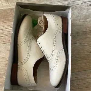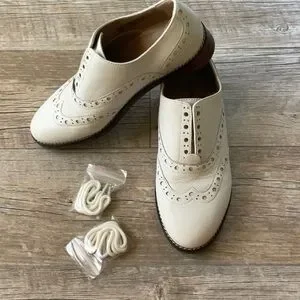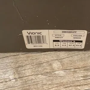 Smart and sweet, Hadley style by Vionic. The box lists these as White, but they are most definitely off-white, like an eggshell tone. Quite comfy as they are Vionic, you can wear these easily all day, with or without the included laces. There is elastic gusset in the vamp if you want to wear them as pictured. Rubber sole for safe traction on all surfaces. Worn maybe a handful of times.