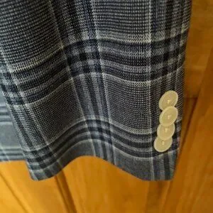 Tommy Hilfiger blue plaid sport coat. Colors include navy, medium blue, white. Double vent back. 3 outside pockets, 3 inside pockets (1 with button). Fabric is 65% polyester, 33% viscose, 2% spandex. Dry clean only. Size 42 short.