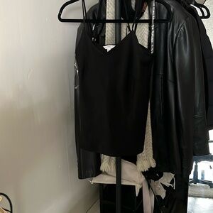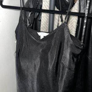 Chic black camisole. Sleek and versatile. Perfect for layering. Made out of a sleek satiny material, has adjustable straps. In worn, good condition, size S (4-6).