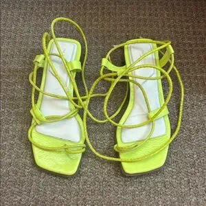 Bright neon yellow sandals with strappy design. Perfect for a bold look.