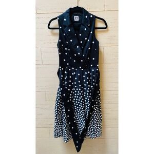 This Anne Klein sleeveless dress features a waist sash and notch collar. The black cotton dress has a white polka-dot pattern and a flared skirt.