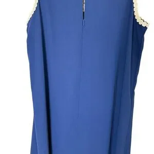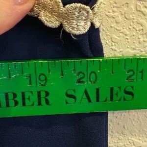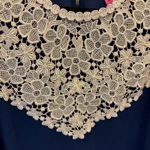 Chic navy dress with elegant gold lace accents around the arms and bib. Very subtle metallic gold. Zipper back with a keyhole closure. Perfect for Wedding guest, shower, any special occasion.