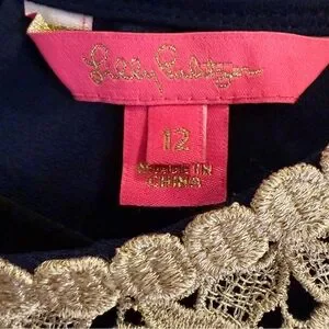 Women’s Lilly Pulitzer Nala Navy Mini Dress with Gold Lace Bib Brocade sz 14