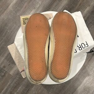Experience the perfect blend of luxury and casual style with these Golden Goose sneakers. Featuring a white leather base with pink laces and a signature distressed finish, these shoes offer a unique, pre-worn aesthetic. These are white with light blue stars, suede toe & tongue, gold on top of back of sneaker with pink distressed shoe strings. I’ve only worn a handful of times. All the distressed markings were there when I bought them. I purchased them from Revolve. I have box, draw string bag, and the passport that comes with Golden Goose sneakers.