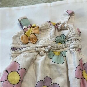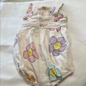 Adorable baby romper with colorful floral design. Features pink, yellow, and purple flowers on a white background.