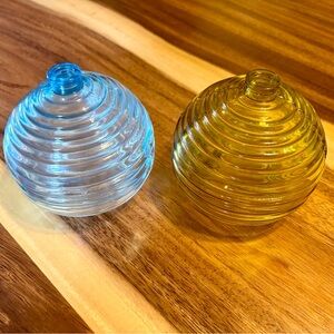 Beautiful ribbed glass vases in blue and yellow. Perfect for home decor. Apple set next to them for size scale.